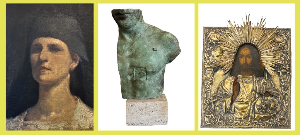 Parmi les pièces à signaler figurent un rare autoportrait de Berthe Burckhardt, un buste du sculpteur Igor Mitoraj et une icône russe du Christ Pantocrator.